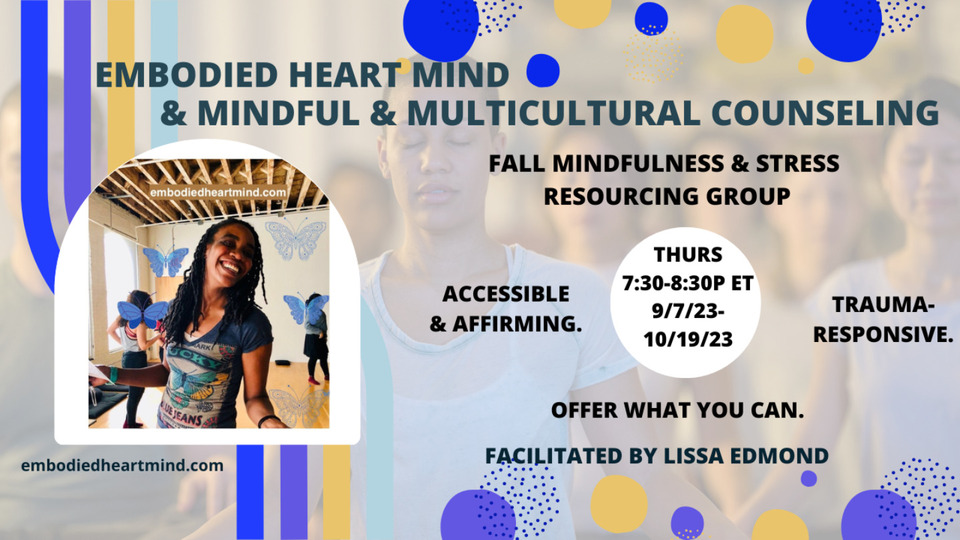 This is a registration form to sign up to participate in a fall mindfulness group course that Lissa Edmond APN-C will be offering in partnership with Embodied Heart Mind (EHM) & Mindful and Multicultural Counseling (MMC).